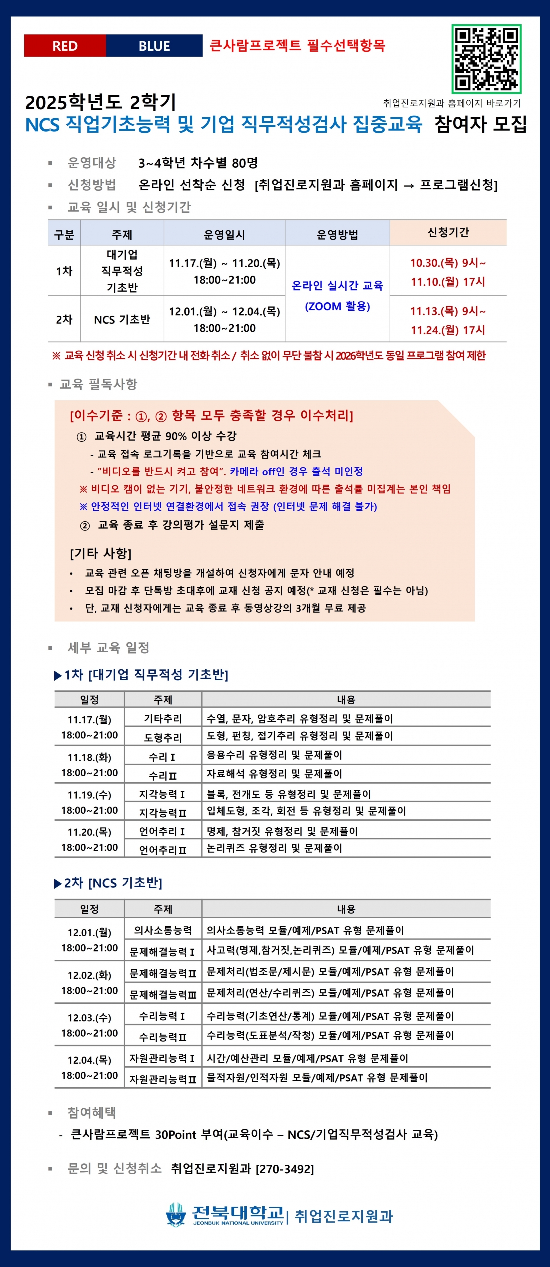 학부[레드/블루벨트 필수선택] 2025학년도 2학기 NCS 및 기업 직무적성검사 집중교육 참여자 모집 관리자2025-11-06조회 164 목록 이전글 2025년 11월 교내 채용설명회 안내 다음글 2025학년도 2학기 전공진로설계 교과목 재이수 안내