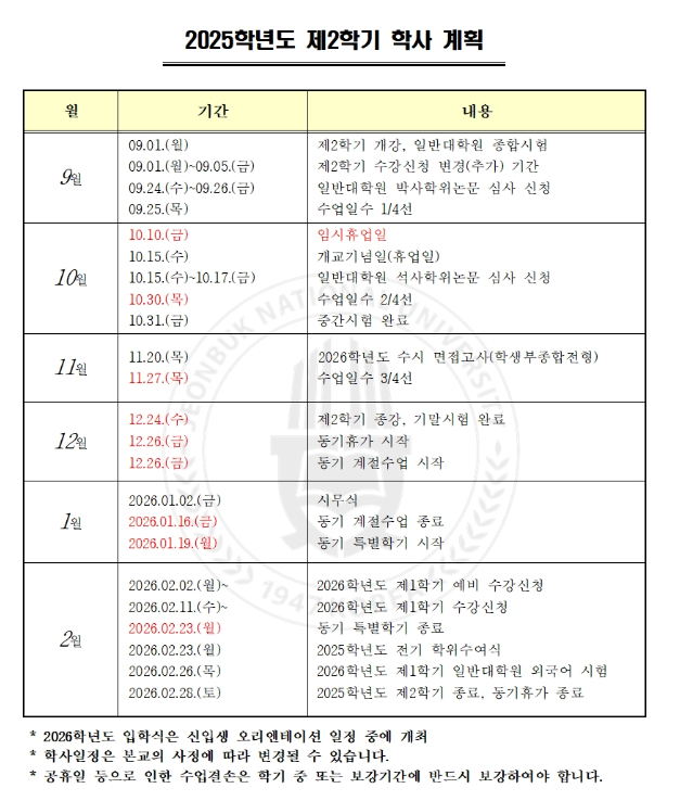 2025. 10. 10.(금) 임시휴업일 지정으로 인해 2025학년도 학사계획이 변경되었음을 안내드립니다.
