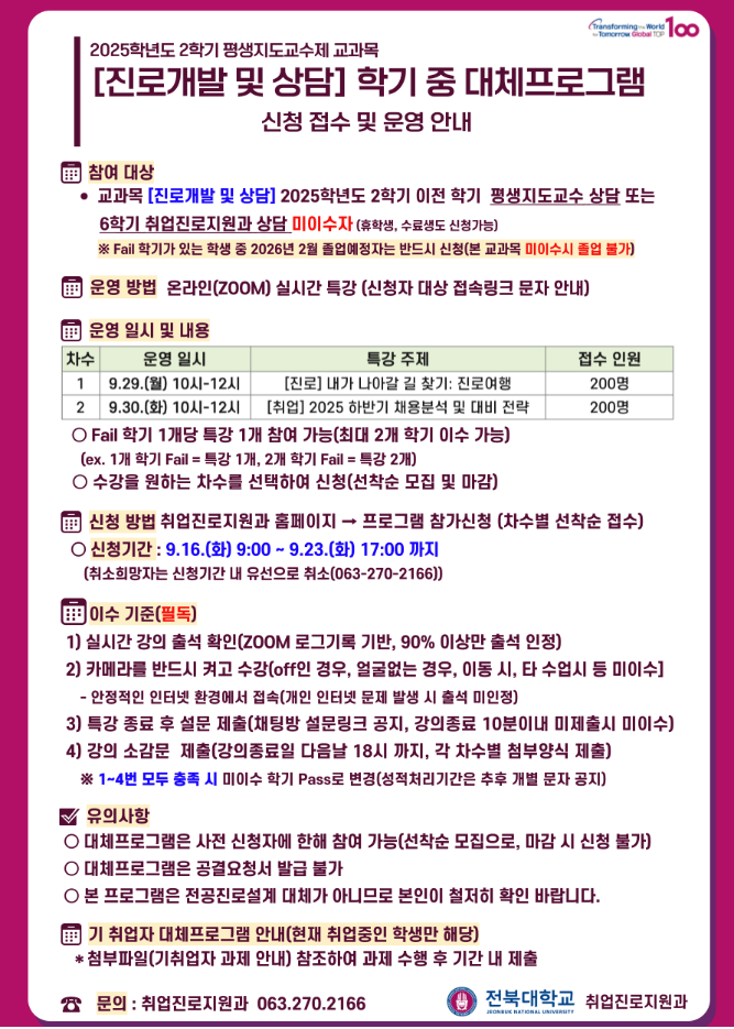 학부평생지도교수제 교과목 [진로개발 및 상담] 학기중 대체프로그램 실시 및 참가신청 안내 관리자2025-09-16조회 488 첨부파일 1. (특강 소감문 제출)진로개발및상담 대체프로그램 특강.hwp (192.0 KB) 2. (기취업자 과제)진로개발및상담 대체프로그램 기취업자 과제 안내.hwp (723.0 KB) 목록 이전글 (10월~11월)취업진로지원과 주요 프로그램 안내 다음글 2025년 11월 교내 채용설명회 안내