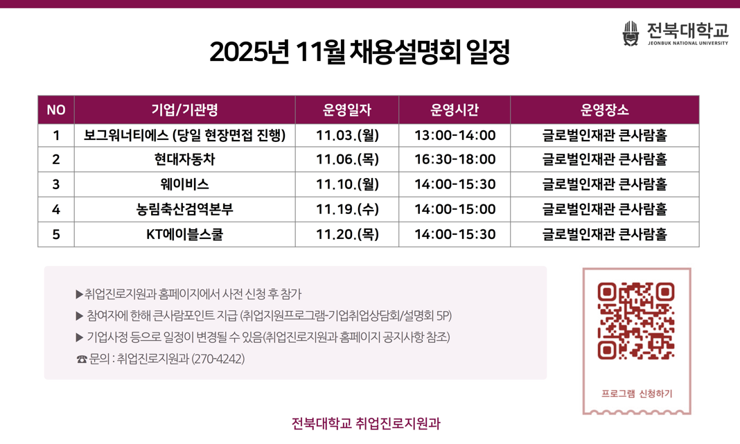 학부2025년 11월 교내 채용설명회 안내 관리자2025-10-30조회 178 목록 이전글 평생지도교수제 교과목 [진로개발 및 상담] 학기중 대체프로그램 실시 및 참가신청 안내 다음글 [레드/블루벨트 필수선택] 2025학년도 2학기 NCS 및 기업 직무적성검사 집중교육 참여자 모집