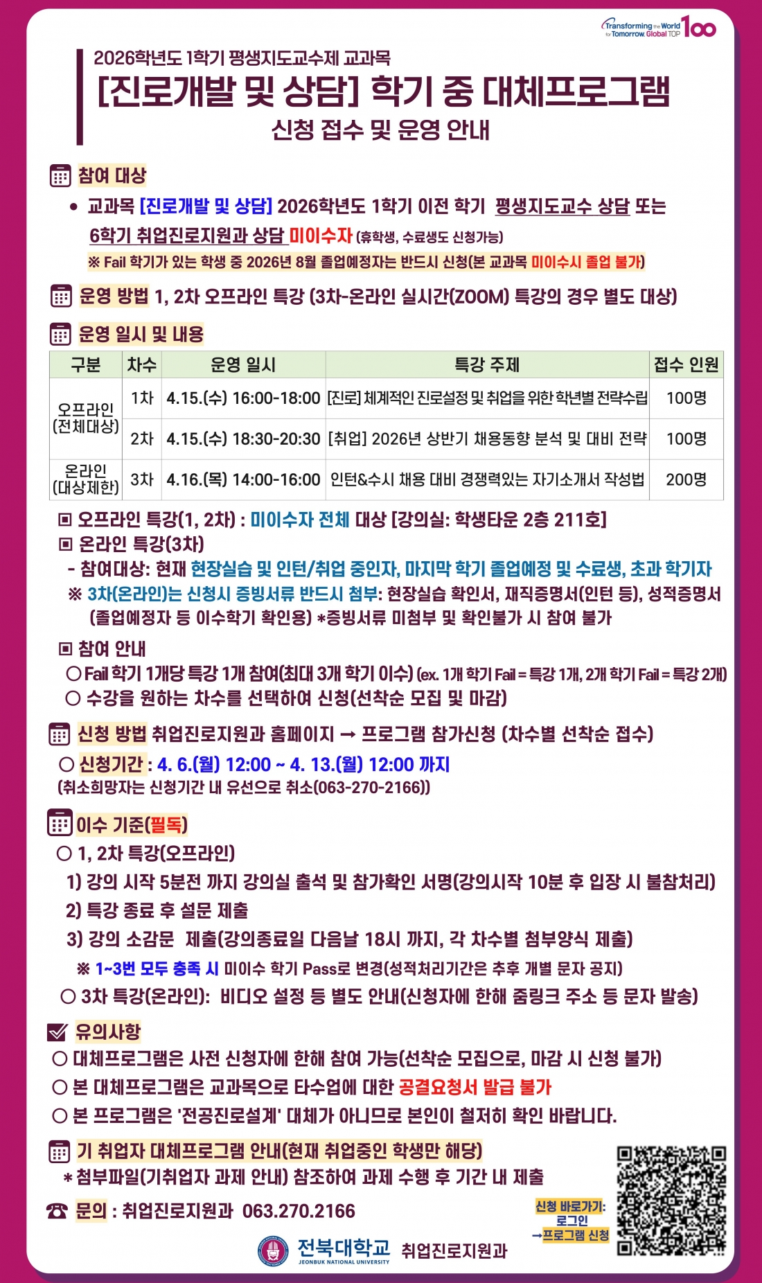 학부평생지도교수제 교과목 [진로개발 및 상담] 학기중 대체프로그램 실시 및 참가신청 안내